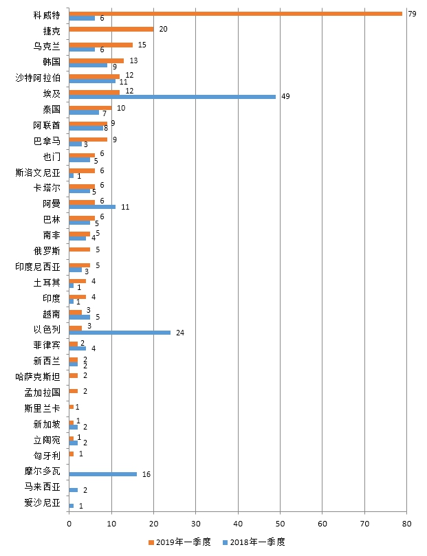 圖1 2018年和2019年一季度一帶一路國家通報(bào)數(shù)比對