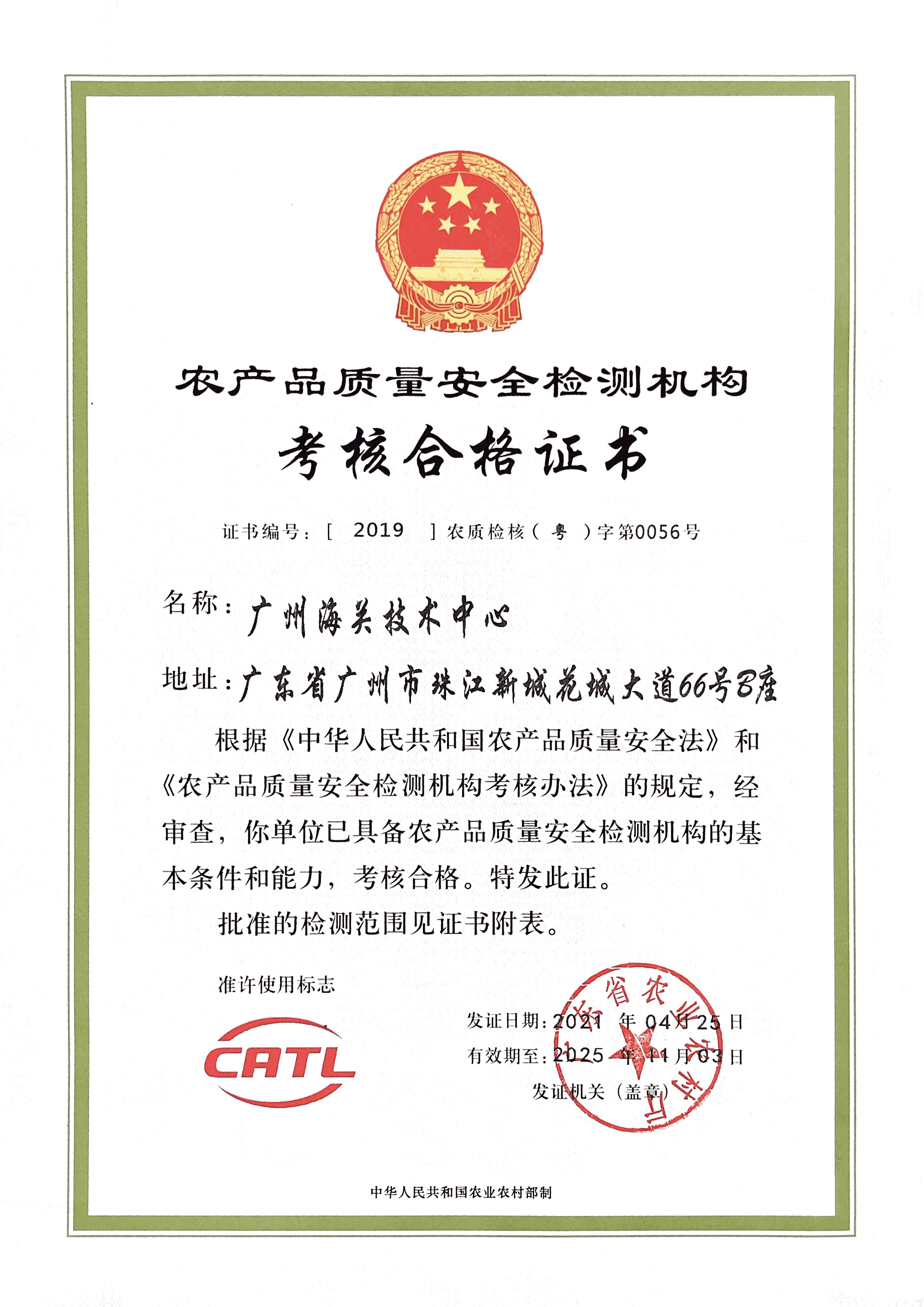 廣東省農(nóng)業(yè)農(nóng)村廳頒發(fā)農(nóng)產(chǎn)品質(zhì)量安全檢測機構(gòu) | 2019第0056號 | - | - | |