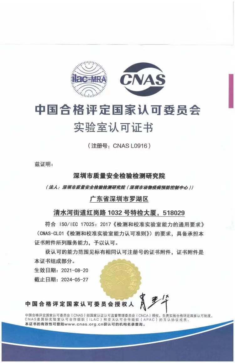 院英文名稱和簡稱:Shenzhen Institute of Quality & Safety Inspection and Research(SIQS)深圳市質(zhì)量安全檢驗檢測研究院(簡稱“深圳質(zhì)安院”),經(jīng)深圳市人民政府批準成立,是深圳市市場監(jiān)督管理局下屬事業(yè)單位,由原深圳市特種設(shè)備安全檢驗研究院與原深圳市農(nóng)產(chǎn)品質(zhì)量安全檢驗檢測中心(深圳市動物疫病預(yù)防控制中心)整合組建。承擔(dān)全市農(nóng)產(chǎn)品質(zhì)量安全和特種設(shè)備安全檢驗檢測,以及動物疫病監(jiān)測預(yù)防工作,為政府部門開展農(nóng)產(chǎn)品質(zhì)量安全風(fēng)險監(jiān)測預(yù)警、重大動物疫情處置、特種設(shè)備安全事故調(diào)查提供技術(shù)支撐,開展農(nóng)產(chǎn)品質(zhì)量安全、動物疫病防控、特種設(shè)備安全相關(guān)技術(shù)研究和科普工作。具有國家市場監(jiān)管總局、農(nóng)業(yè)農(nóng)村部等核準的一系列檢驗檢測資質(zhì),擁有能力過硬、經(jīng)驗豐富的檢驗檢測技術(shù)隊伍。以“科學(xué)、公正、嚴謹、高效”為質(zhì)量方針。